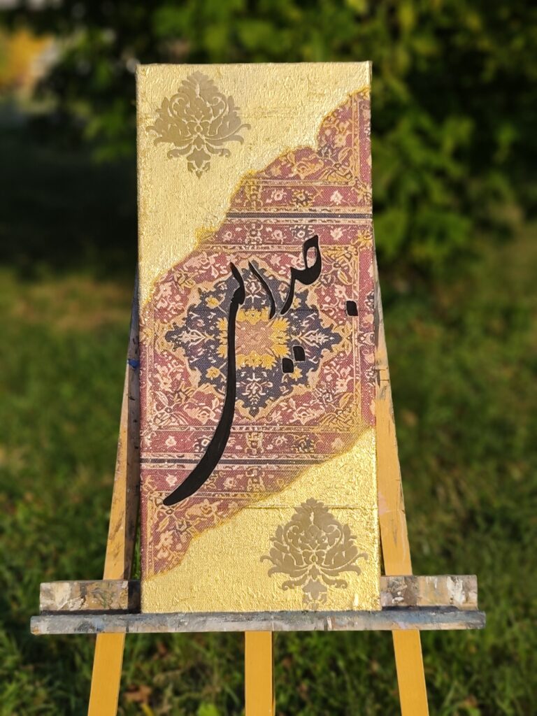 The painting bears the word جدایی – “separation.” With golden light flowing across the woven patterns of a Persian carpet, it echoes Hafez’s verse where love and loss are inseparable companions. The delicate balance between beauty and sorrow reminds us that even separation carries within it the trace of longing, making presence and absence part of the same eternal dance. ( size of canvas 70×30 cm )