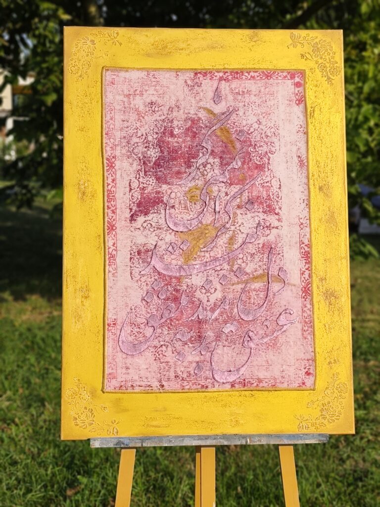 The golden frame surrounds a carpet field where the verse emerges through textured paste, rising subtly above the patterned ground. Love here is not portrayed as a fleeting sentiment but as a devotion worthy of sacrifice — the giving of life itself. The pink tones breathe with passion, while the tactile surface anchors the poetry in tradition. Together they form a dialogue between sacrifice and beauty, reminding us that only through surrender to love does the heart truly move. ( size of canvas 100×70 cm )
