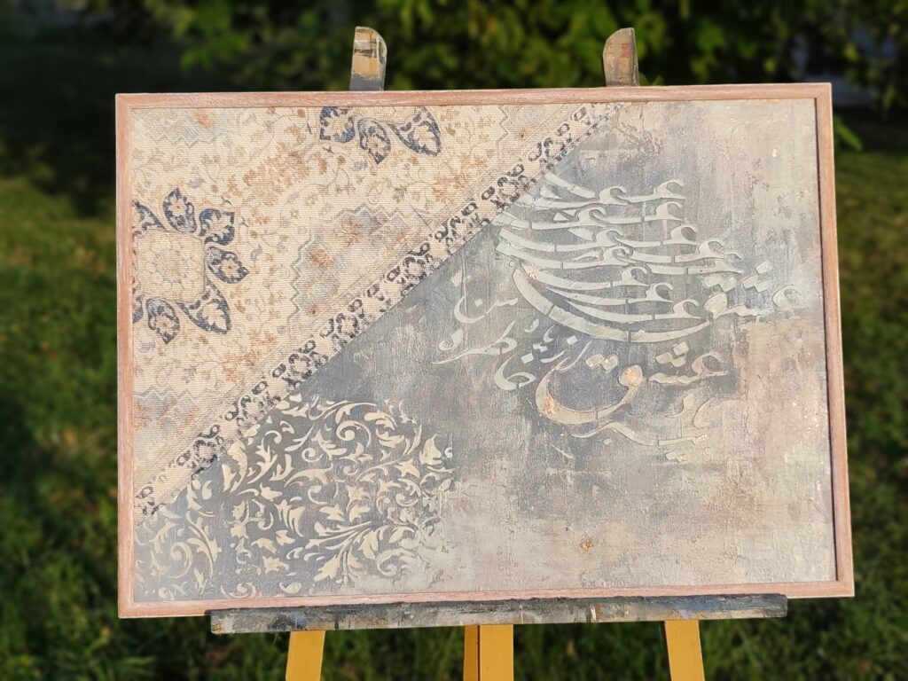 Layered textures of carpet and ornament carry the echo of tradition, while the calligraphy emerges like an eternal reminder: love alone remains, and its memory never leaves the heart.